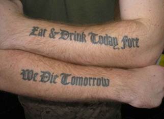 Um, the biblical verse, as usually translated into English, is, “Let us eat and drink, for tomorrow we die”—the statement elegantly terminates with the key word. This fellow’s artistic license in altering the wording and word order is excusable, but the misspelling of fore—not likely a pun on forearm—is not. I would have recommended the standard version, broken after drink—but “broken after drink” is probably the reason for the mistake in the first place.