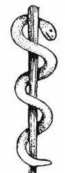 A little more vocabulary for you, related to our friend the messenger: as you can see in the sculpture above, Mercury is carrying an odd looking staff. This staff, carried by heralds and messengers, is called a caduceus. It is winged at the top, and has two snakes intertwining their way up from the bottom. The caduceus represents commerce, though many people misuse it to represent medicine. There is actually a different symbol that should be used for medicine: the Staff of Asclepius. Asclepius was the ancient Greek god of medicine and healing.