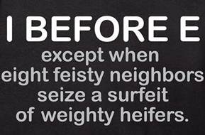 As promised, today I have some helpful information on that “I before E, except after C” guideline that many of us learned in grade school. Most people complain that this is a useless rule in English. One of our co-workers told me she relives the trauma of a spelling bee lost after using this rule, every time she hears it. Another co-worker has embraced the guideline as his own, with the version: “I before E, except in Keith.” Until I saw the rhyme in its entirety, I agreed that it seemed useless.