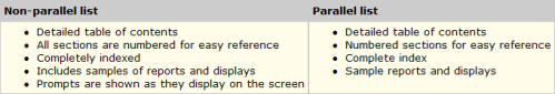 Use parallel construction in lists and in sentences that list items. Be sure that each item is parallel with the other items in the list. Otherwise, the list can sound awkward and be confusing. Use the same sentence structure and the same verb form and tense for each item in the list. For example: