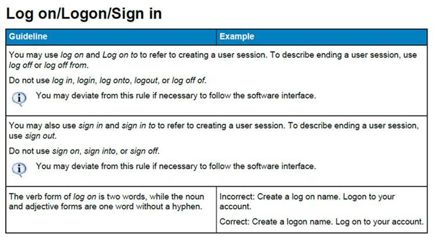 I’m so glad you asked! The JHA Style Committee works hard to make decisions about these things and we keep track of the decisions in the JHA Style Guide for Technical Communication and Training (click here for the internal document). For your immediate viewing pleasure, here is a screen shot of that section, and as you can see log on and log off are the preferred terms for verbs; logon is the preferred noun and adjective form.