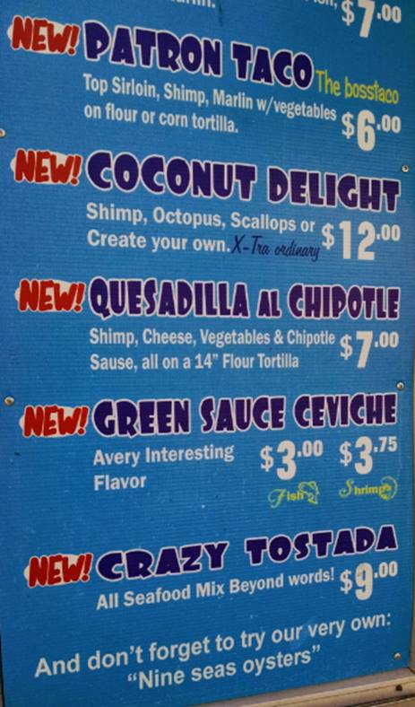 I’m recovering from bronchitis and a head cold—you know how nasty San Diego winters are. I don’t have my books here with me today, so I’m sending you a lovely photo my husband brought back from his lunchtime trip to his favorite taco truck. Apparently, they are proudly displaying new signs, but they didn’t ask the Editrix for any help. I think my favorite part is the $12.00 Coconut Delight, which promises to be X-Tra ordinary. Outside of this error, I spy capital letters a-go-go, spelling problems, punctuation errors, and more. If you can find at least 10 errors, I suggest you stop at the 9 Seas taco truck on 30th and Grape St. and offer your editing services.