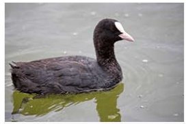 1. Any of various slaty-black birds (genus Fulica) of the rail family that somewhat resemble ducks and have lobed toes and the upper mandible prolonged on the forehead as a horny frontal shield