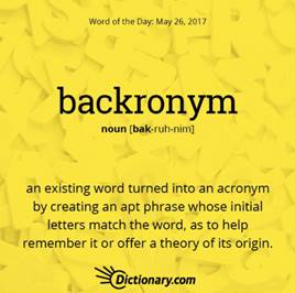 We all know about acronyms: abbreviations that are formed from the initial letters of other words and that are pronounced as a word (not as individual letters)—for example, NASA and NATO. Well, a backronym is an existing word that is turned into an acronym.