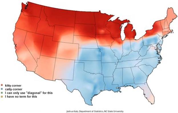 (As the author notes, “caddy-corner” is not acceptable unless you are talking about somebody in a corner holding your golf bags, and I would add that “kiddie-corner” is not an appropriate spelling unless someone has been stuck in the corner for being naughty.)