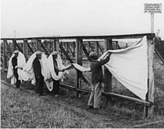 Tenterhooks are hooks in a device called a tenter. Tenters were originally large wooden frames which were used as far back as the 14th century in the process of making woolen cloth. After a piece of cloth was woven, it still contained oil from the fleece and some dirt. A craftsman called a fuller (also called a tucker or wa[u]lker) cleaned the woolen cloth in a fulling mill, and then had to dry it carefully or the woolen fabric would shrink. To prevent this shrinkage, the fuller would place the wet cloth on a tenter, and leave it to dry outdoors. The lengths of wet cloth were stretched on the tenter (from Latin tendere, meaning ‘to stretch’) using tenterhooks (hooked nails driven through the wood) all around the perimeter of the frame to which the cloth’s edges (selvedges) were fixed, so that as it dried the cloth would retain its shape and size. In some manufacturing areas, entire tenter-fields, larger open spaces full of tenters, were once common.