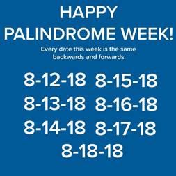 I may not be the first, but let me be the most enthusiastic in wishing you a happy Palindrome Week! Who doesn’t love a palindrome? Maybe only those who aren’t quite sure what it is. So, for those folks, here’s a definition: a palindrome is “a word, phrase, or sequence that reads the same backward and forward, e.g., madam or nurses run.” This is a very special week because every date is a palindrome.