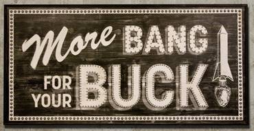 Bang for the buck is an idiom meaning the worth of one’s money or exertion. The phrase originated from the slang usage of the words "bang" which means "excitement" and "buck" which means "money." Variations of the term include "bang for your buck," "bang for one’s buck," "more bang for the buck," "bigger bang for the buck," and mixings of these. "More bang for the buck" was preceded by "more bounce to the ounce," an advertising slogan used in 1950 to market the carbonated soft drink Pepsi.
