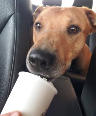 My boy, Harvey, enjoying a Starbucks™ “puppuccino.”