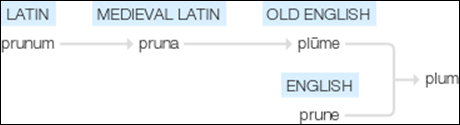 And here is the etymology of plum, which should look a little familiar, since we call the dried version of this fruit by something closer to the original Latin (prunum).