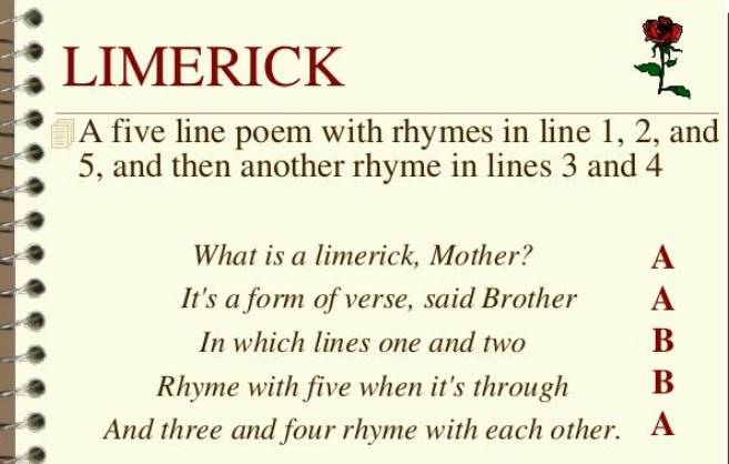Second, its rhyme scheme: A limerick always has an AABBA rhyme scheme, meaning that the first, second, and fifth lines end in a shared rhyme, as do the third and fourth…