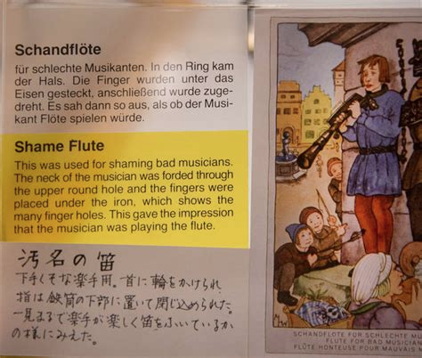 And then there’s the whole Schandeflote (shame flute). I thought it was a necklace indicating you were a bad musician—you know, a little gold flute on a chain. Silly me! We are talking German shame. This “necklace” is a device that buckles your fingers down to your instrument! Here is a picture from our coworker, Lori: