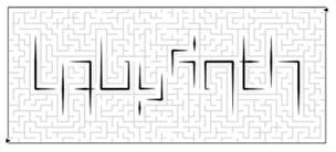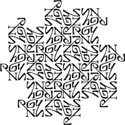 Tessellation with two 90° centers of rotation designed by Scott Kim. This design practices synergy in two ways first, the word crosses itself four times at two different types of junctions: S becomes Y and E becomes R. Second, letters are joined in pairs, reducing the number of modules to just three.