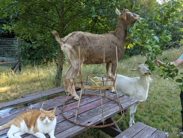 My brother’s goats, Lewis (on table) and Clark (politely on the ground), are happy to give you a lick, but they certainly never make promises.