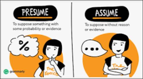 Another pair of words that are often confused are assume and presume. These words are a little tricker because both words mean “to take something as true”; however, there is a slight difference in meaning.