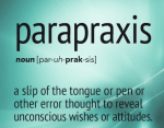 | parapraxis | From the Latin para meaning beside and the Greek praxis, for a doing, a parapraxis is an instance in which you say one thing and mean your mother er, another.