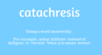 | catachresis | From the Greek word meaning abuse or misuse, catachresis happens when a speaker mistakenly uses a word that seems really similar in place of the correct word. These blunders arent necessarily humorous.