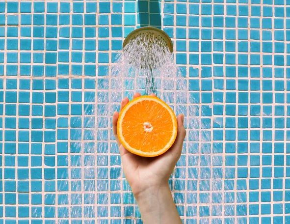 an orange that is peeled and eaten under a steamy shower, the purported benefit being that the steam enhances the orange’s citrusy fragrance and creates a soothing experience for the person who is showering: