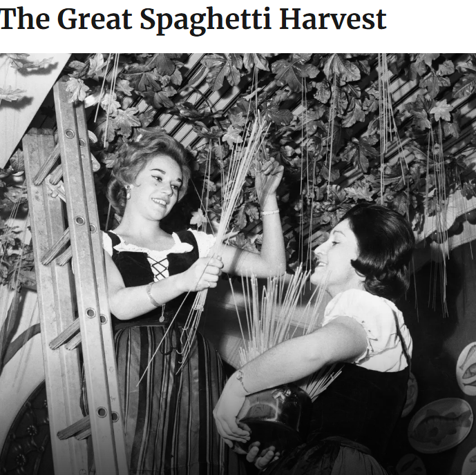 - In 1957, the BBC reported that Swiss farmers were experiencing a record spaghetti crop and showed footage of people harvesting noodles from trees [KC – And vines. See photo below.]