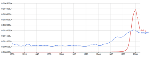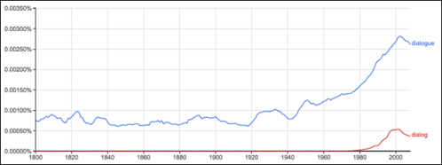 The British rarely use the spelling dialog, whether it be when writing about an interchange with people or communicating with the computer. The following chart is from Writing Explained, and it shows the British use of each spelling over time: