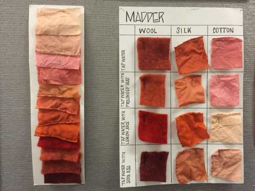 The madder root is the part of the plant the color “red” comes from. Here are some different types of fabric and how bright or light madder root dye can make them.
