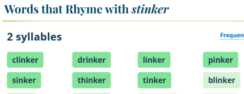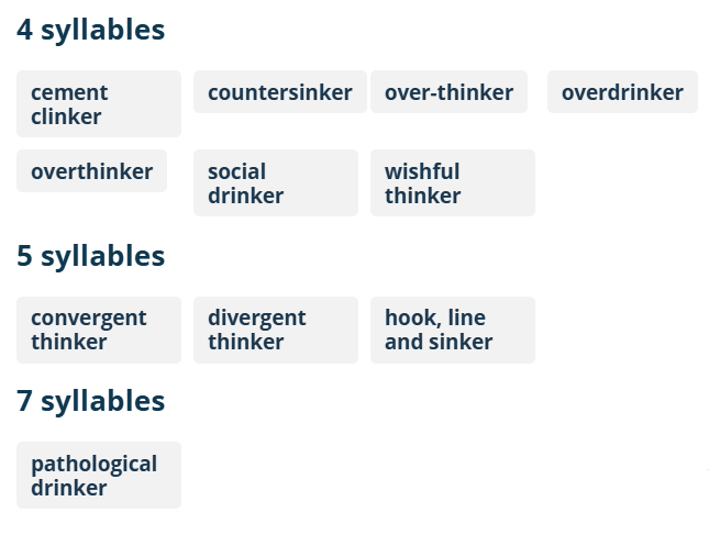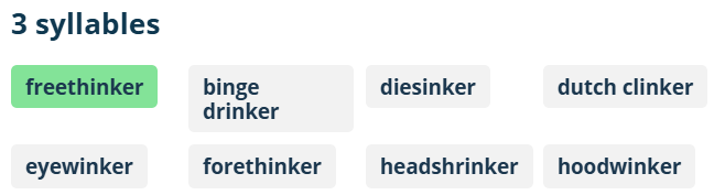 This won me over when I saw that they didn’t stop at two-syllable words—they came up with all kinds of matches! Stinker, binge drinker, eye winker; hook, line, and sinker; wishful thinker…think of the magic that could come from this lineup!