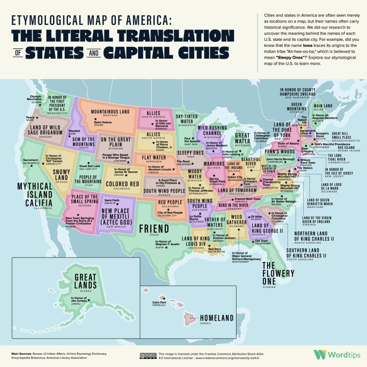 To put together this etymological map of America, Wordtips pulled from multiple resources, including the American Library Association, the Online Etymology Dictionary, and the Bureau of Indian Affairs. The website used a minimum of two sources to determine each etymology in the report.
