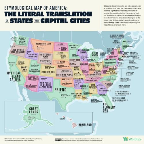 Good morning, fellow travelers. The other day I sent out a list of the most difficult city names to pronounce, across the U.S. I was still fiddling around with that Mental Floss article when I saw the map at the bottom of this article. It is an etymological map of the states and their capitals. We’ve covered things like this before, but I love etymologies and love this map because it’s all there for us to see, but it’s brief. (I’ve been taking a LinkedIn® course about infographics and our visual vs. text understanding and memories.)