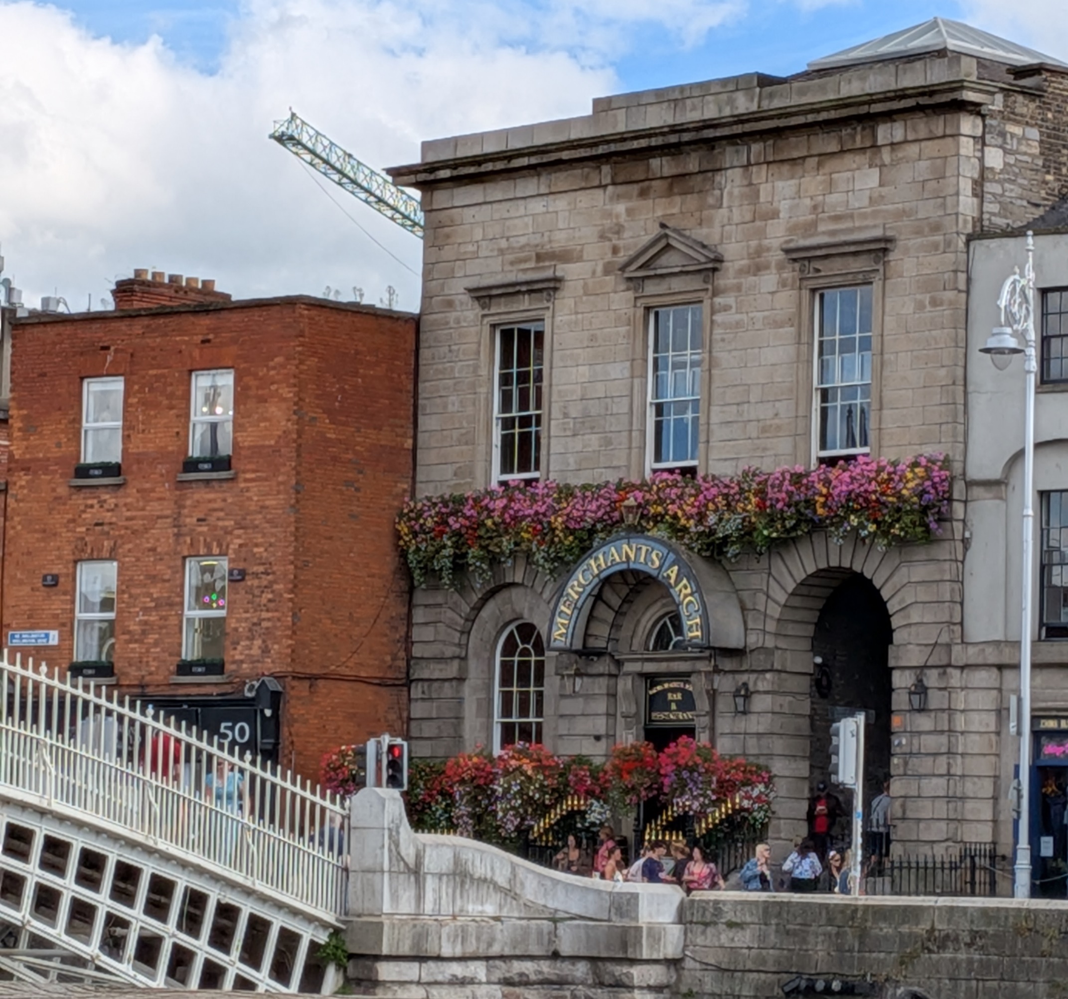 Here is a view from a quay where we are having coffee, looking across to the other side of the river. The white bridge is the Ha’penny Bridge and the Merchant’s Arch is a pub.